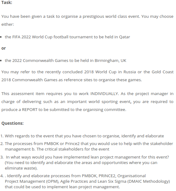 Well, that is all the excitement that shall accompany this assignment. The objective of this assignment is to submit an event report to the supposed organising committee, keep up with the marking rubrics and score what accordingly!
